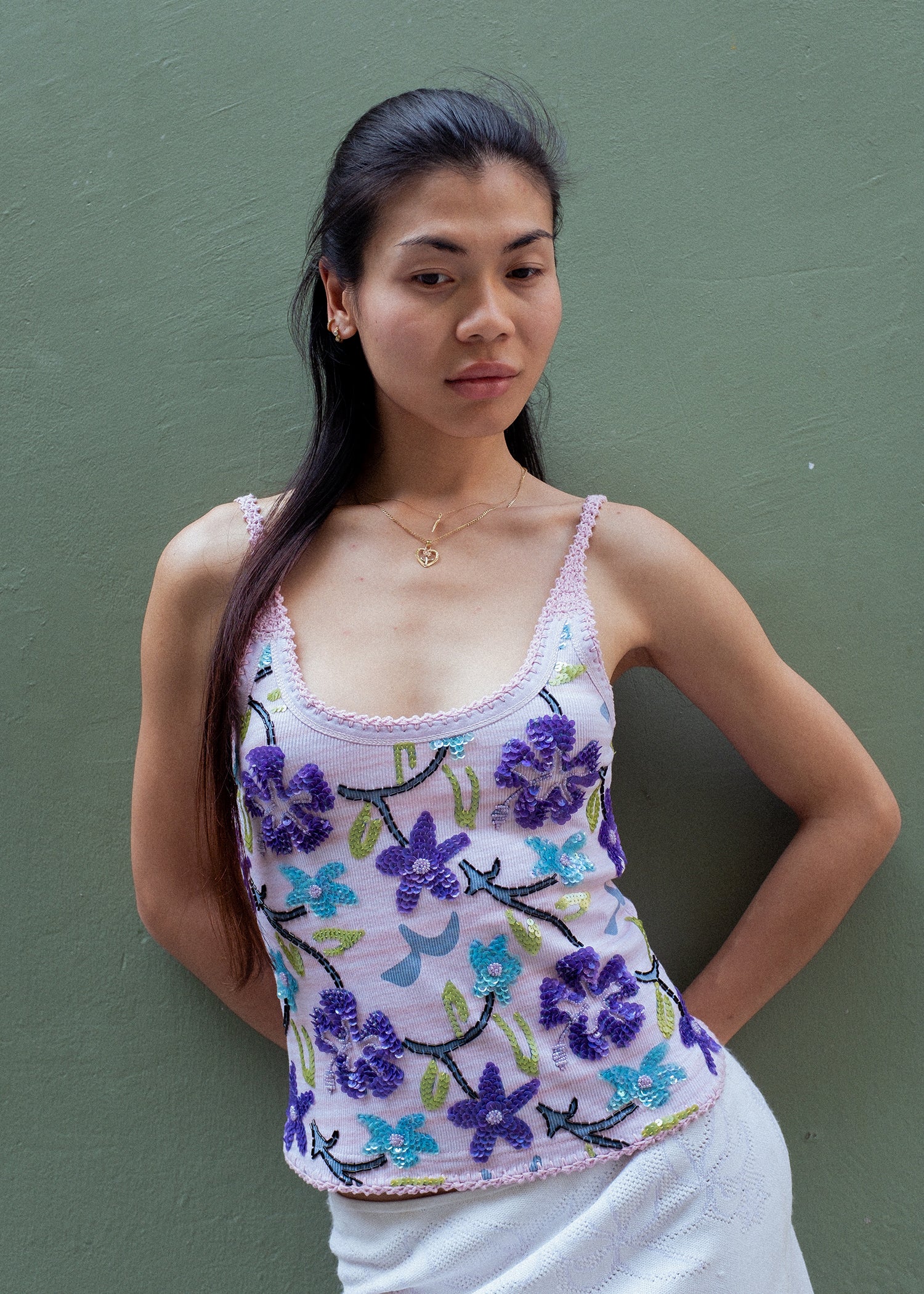 A fresh take on a classic — this ribbed cotton tank top is elevated with hand-knitted crochet straps and hem details. Embellished with hand-embroidered sequins and beads, each piece is uniquely adorned using 100% deadstock materials.